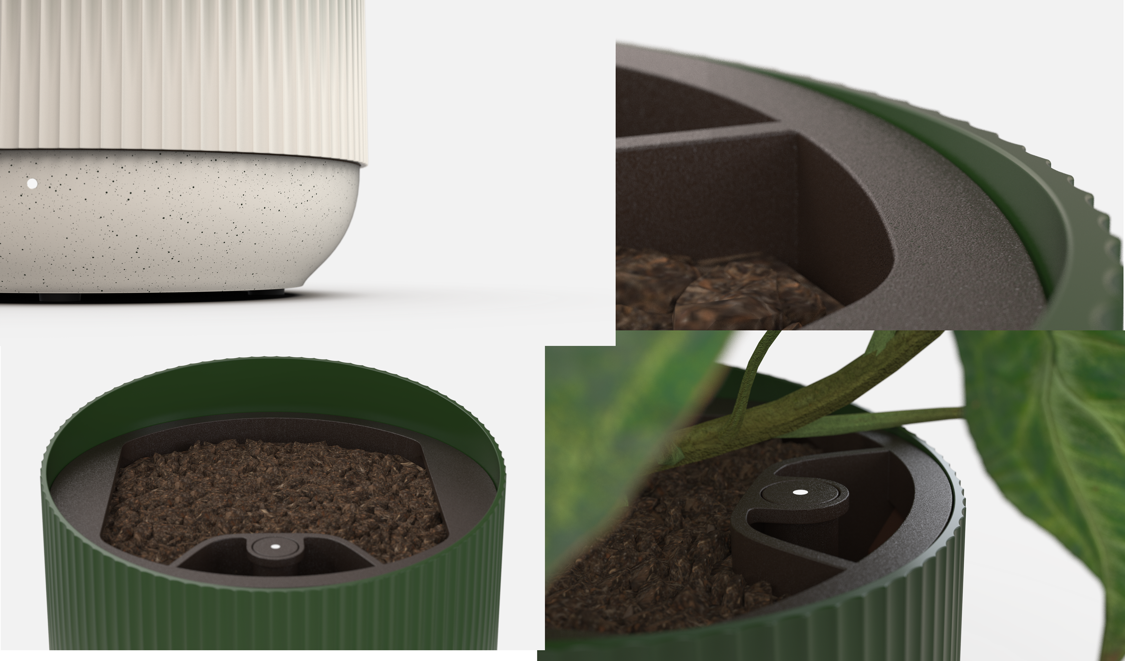 Thanks to the technology implemented in the flowerpot, the air is sucked through the soil and released clean.
