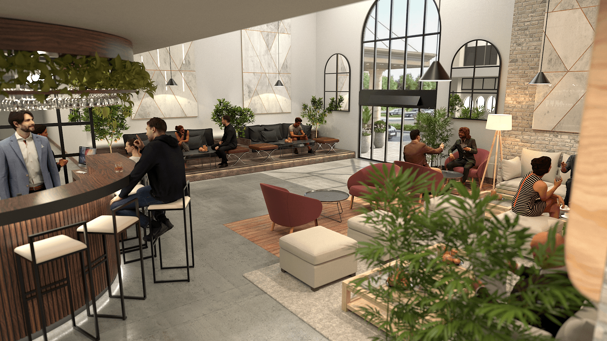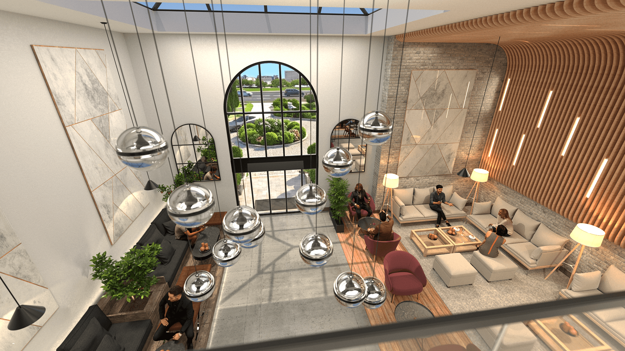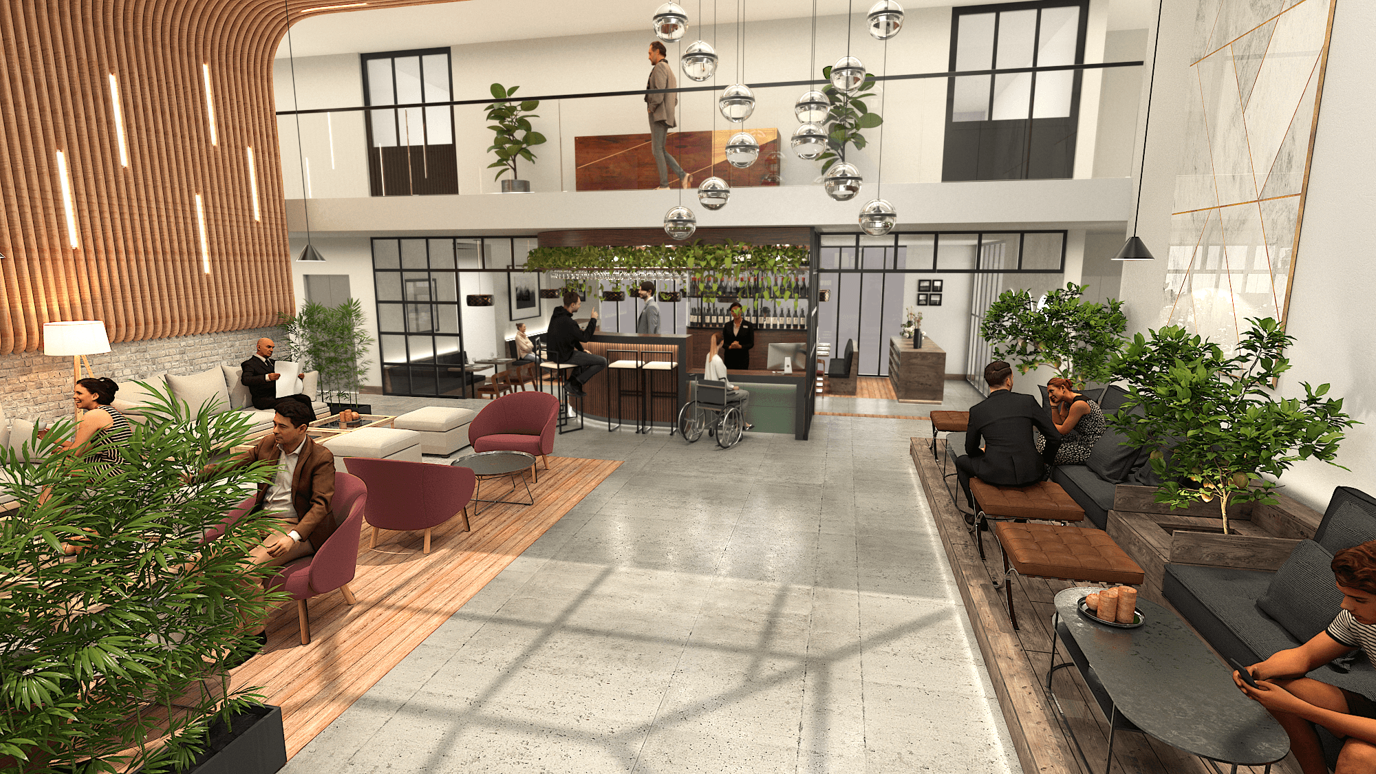 The lobby is articulated into three distinct zones