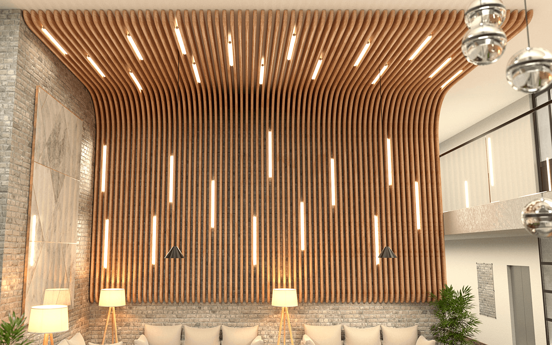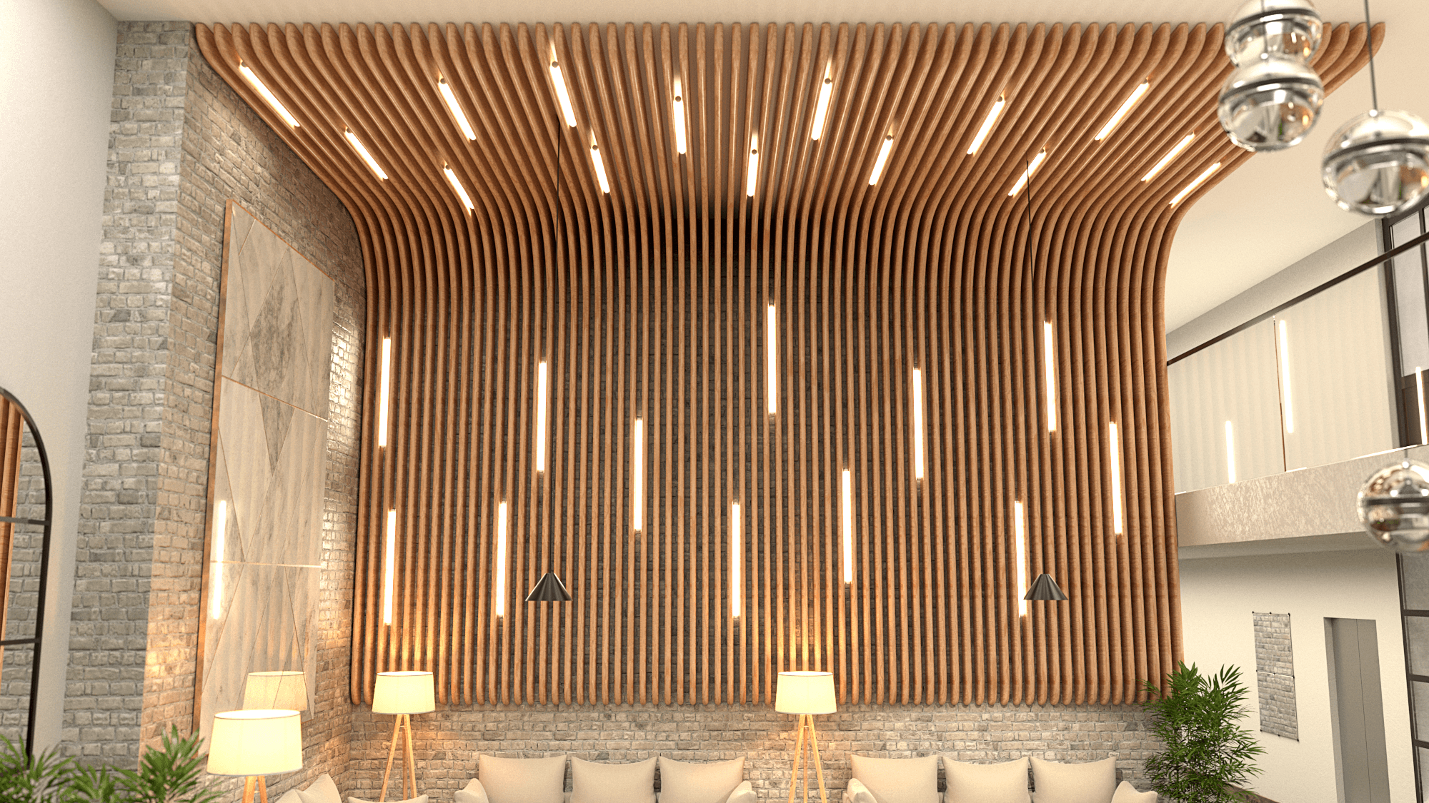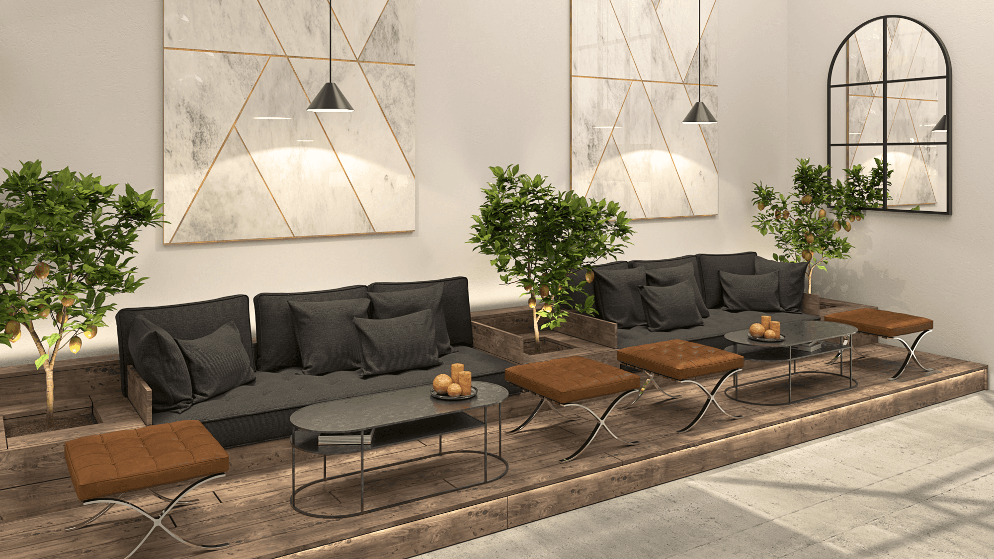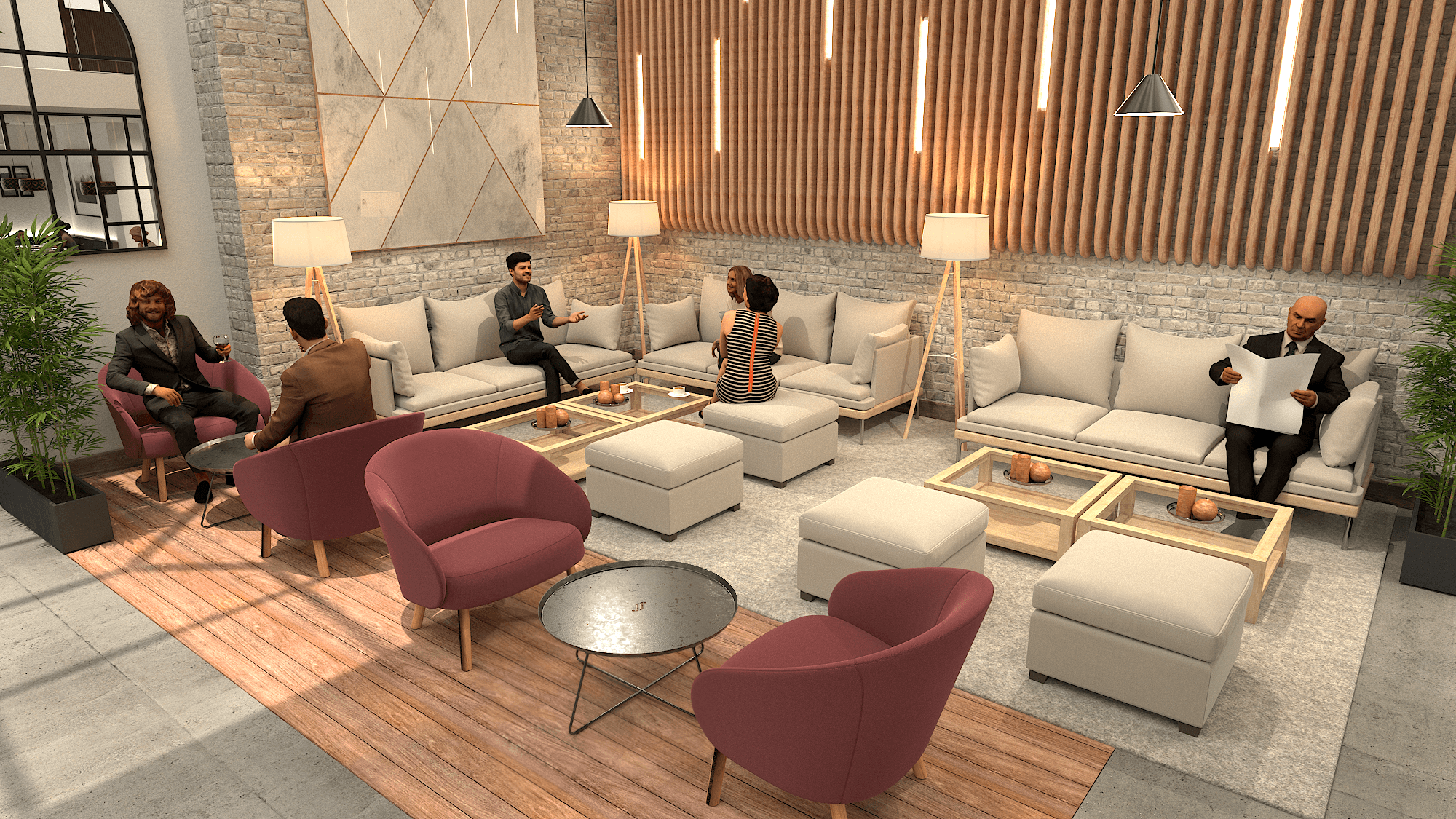 Custom wooden plank sofa will provide a space for guests to relax, enjoy a drink, or wait briefly.