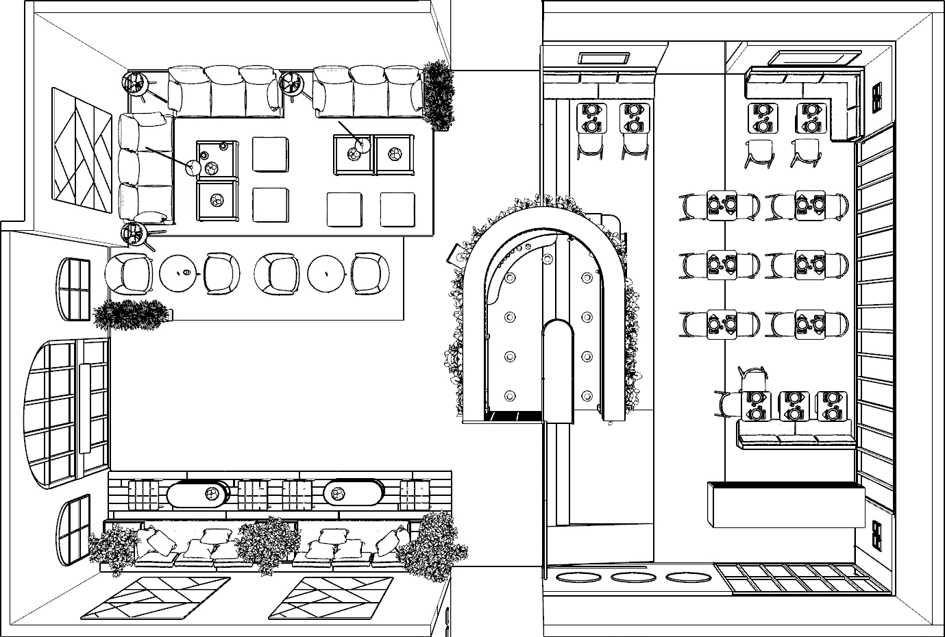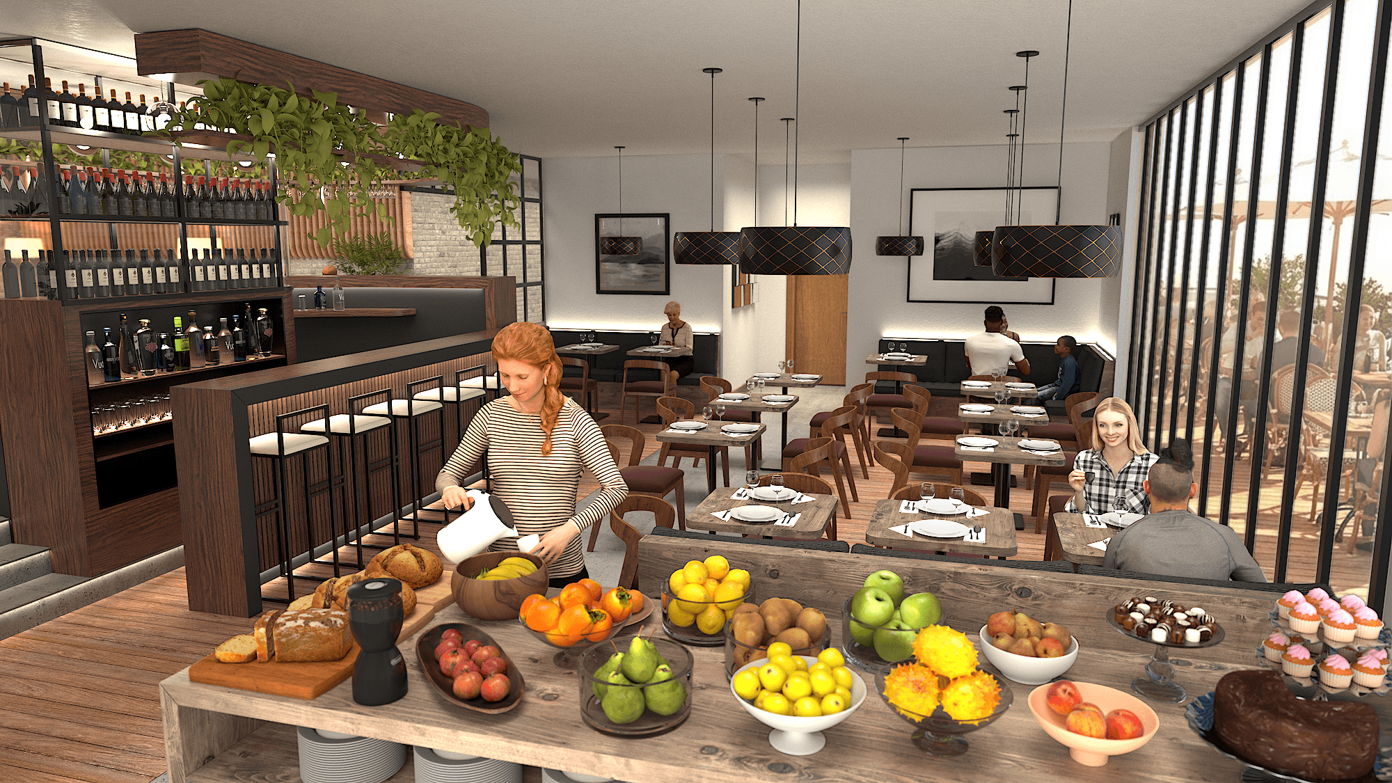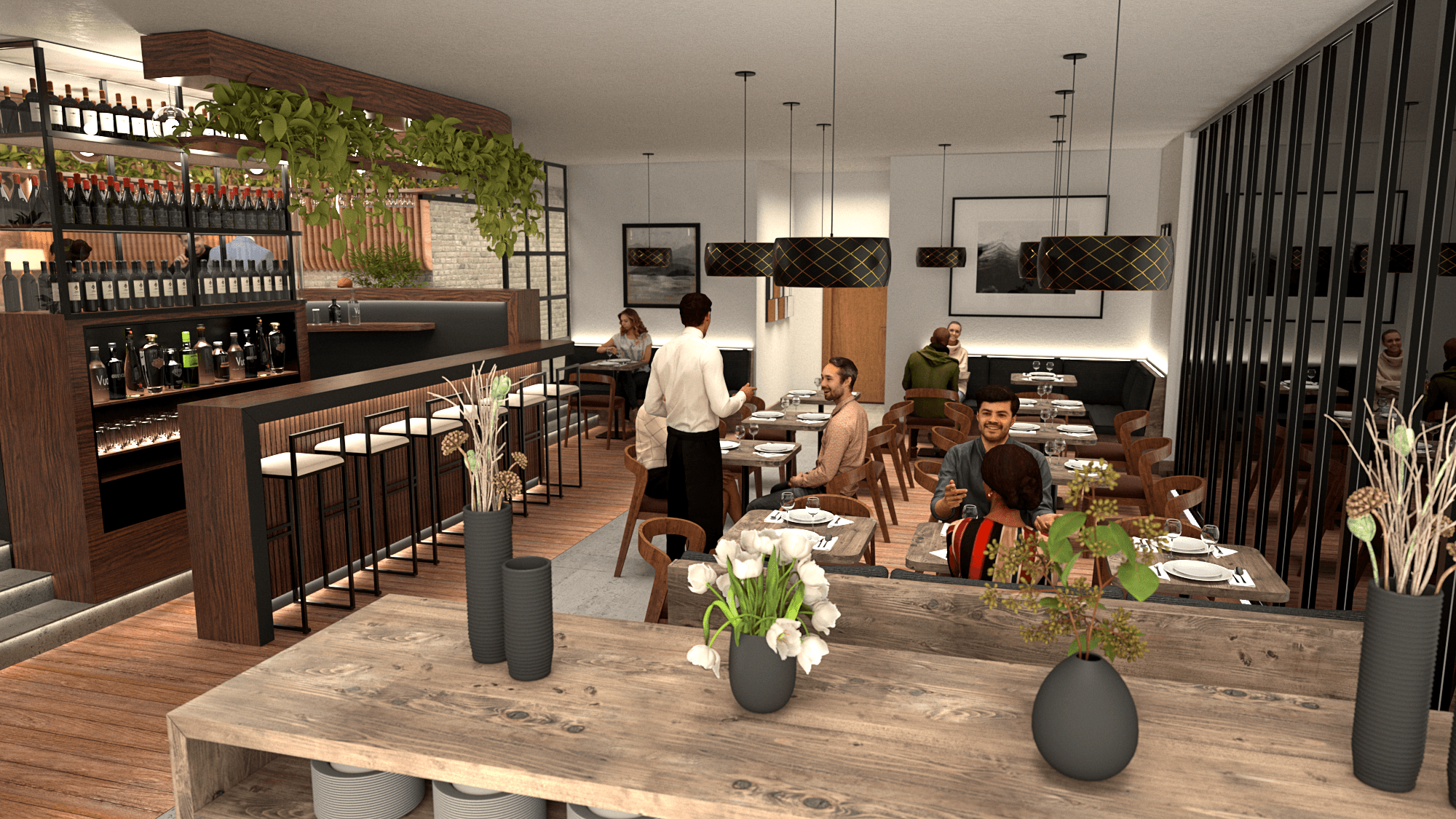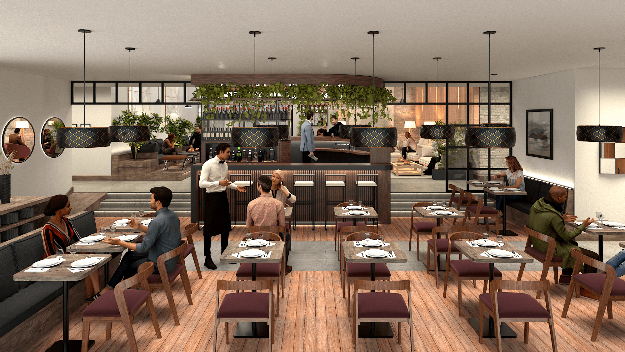 Interior concept for a 4-star hotel restaurant combining dining, bar and reception in a unified space.