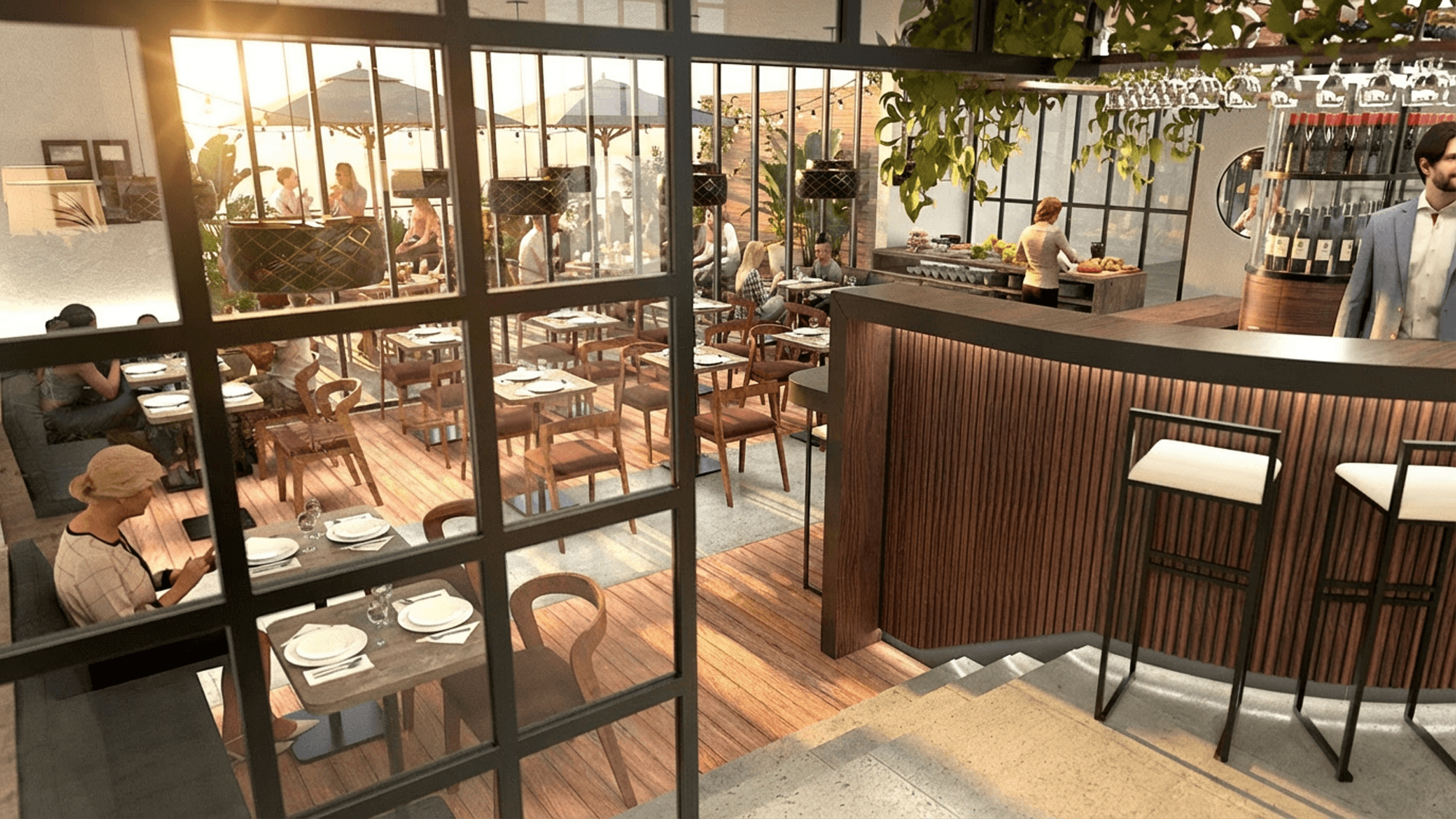 The bar straddles the two steps leading down to the restaurant, establishing a spatial connection between levels. It accommodates seating on both sides, allowing guests to enjoy a drink or dine from the restaurant side.