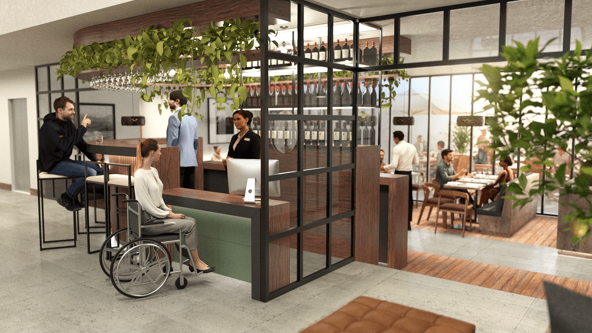 The reception counter is lowered to ensure universal accessibility, allowing all guests—including those with reduced mobility (PRM)—to check in comfortably and feel welcomed.